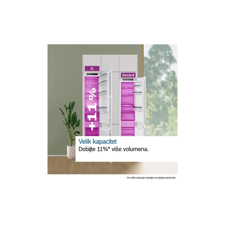 Bosch KIN96VFD0 je ugradbeni frižider visine 193 cm s NoFrost tehnologijom koja eliminira nakupljanje leda i olakšava održavanje. Hladnjak nudi ukupnu zapreminu od 215 litara, dok zamrzivač ima 75 litara, pružajući dovoljno prostora za svakodnevne potrebe veće porodice. Opremljen je sustavom svježine VitaFresh, funkcijama SuperCooling i Super zamrzavanje za brže hlađenje i zamrzavanje namirnica. LED osvjetljenje, praktične police i ladice omogućavaju preglednost i jednostavno korištenje. Energetski razred D osigurava optimalnu potrošnju energije, dok razina buke od 34 dB garantuje tihi rad.
