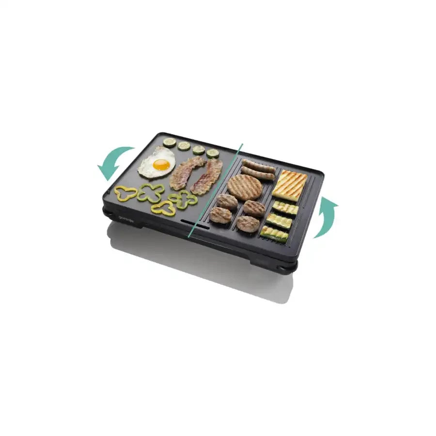 Gorenje TG2000LCB je stolni električni roštilj sa reverzibilnim pločama (jedne rebraste, druge ravne), idealan za grilling ili pripremu jaja i palačinki. Ima XXXL površinu za pečenje od 32×48 cm, snagu 1800 W, termostat s pet temperatura i indikatorom kada se postigne željena temperatura. Sistem za odvod masnoće i non-stick premaz čine čišćenje jednostavnim, a podesiva visina nogu omogućava stabilnost čak i na neravnim površinama.