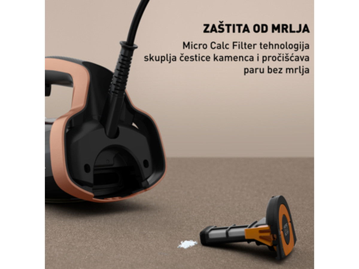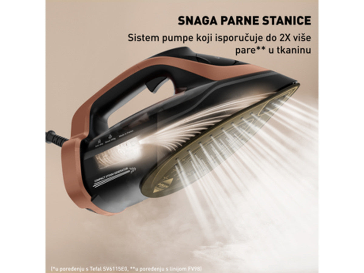 Tefal FV9E50E0 (Ultimate Power Pro) kombinuje performanse parne stanice sa kompaktnim formatom pegle. Snaga od 3200 W omogućuje izuzetno brzo zagrijavanje i efikasno peglanje.Pruža kontinuirani protok pare od 85 g/min i udara pare do 300 g/min, što olakšava uklanjanje tvrdokornih nabora.Elektronski LCD panel nudi 5 automatskih postavki (Nylon, Silk, Wool, Cotton, Linen) koje automatski prilagođavaju paru i temperaturu, što pojednostavljuje proces i smanjuje rizik od oštećenja tkanina.Podnica Durilium AirGlide Autoclean pruža odlično klizanje i samoočišćavanje, tako da ostaje glatka i bez ogrebotina.Takođe podržava vertikalno peglanje (steaming), što je idealno za osvježavanje zavjesa i odjeće direktno na vješalici. Ugrađen je mikro‑Calc filter za kontrolu kamenca, sistem protiv kapanja (anti‑drip) i automatsko isključivanje za veću bezbjednost.